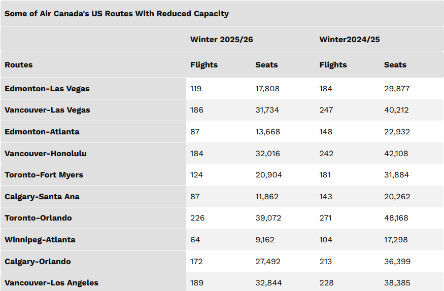 In addition, frequencies to Los Angeles, Phoenix, and Minneapolis have also been reduced. Winnipeg is another market seeing fewer flights. Winnipeg–Atlanta has fallen from 104 flights to 64, with seat capacity cut nearly in half. Winnipeg–Los Angeles has been suspended since June. Ottawa–Fort Myers, Regina–Orlando, and Vancouver–Santa Ana are also off the schedule.