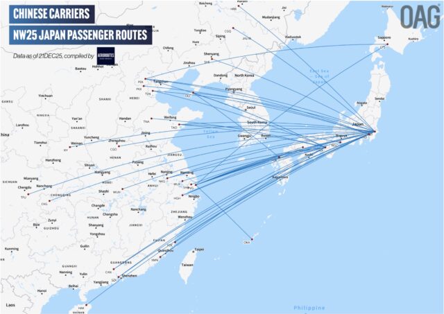 Based on OAG schedules analyser data updated on 21DEC25 and AeroRoutes research, there are 48 nonstop routes being cancelled with no alternate nonstop flight options, including flights served by Japanese and Cambodian carriers. Chinese media cites 46 routes since the cancellation only highlights the period of 21DEC25 – 04JAN26, while AeroRoutes’ research covers up to late-February 2026.