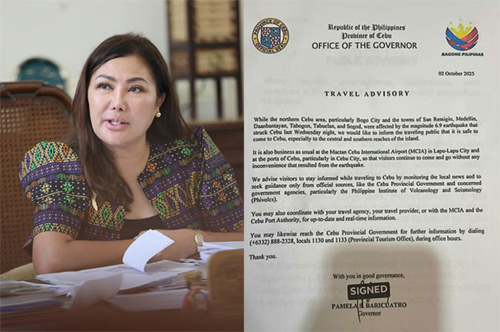 In a travel advisory dated October 2, 2025, which is still in effect until now, Governor Pamela Baricuatro said while Bogo City and the towns of San Remigio, Medellin, Daanbantayan, Tabogon, Tabuelan, and Sogod were affected by the earthquake, travel to Cebu—particularly to its central and southern areas—remains safe.