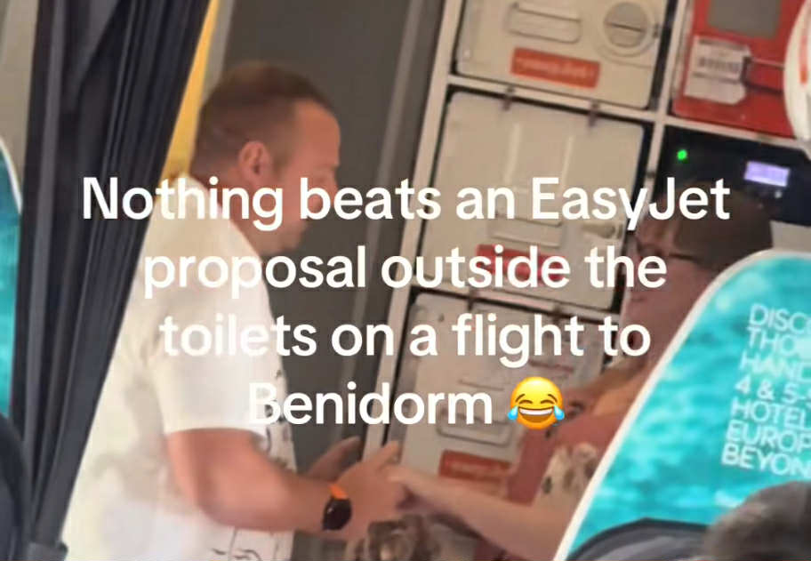 Passenger Nicki Gunner recorded the mid-flight proposal and shared it to his TikTok account (@nickigunner), writing, ‘Nothing beats an East Jet proposal outside the toilets on a flight to Benidorm.’