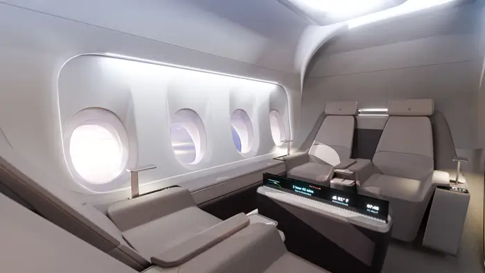 - The up to 240-passenger plane may have less natural light but could offer lounges or kids’ zones.