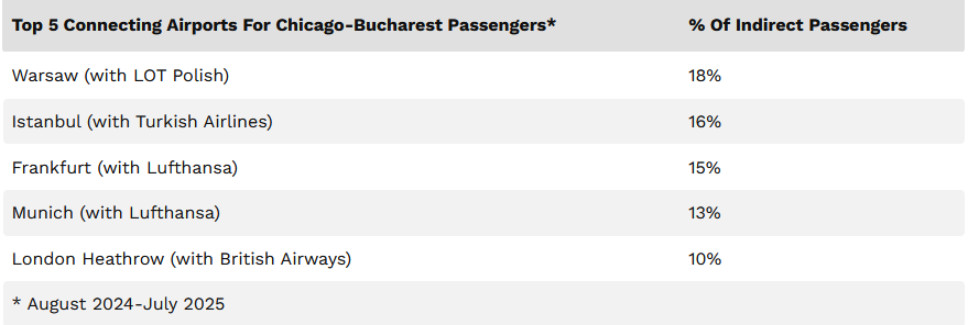 According to booking data for the 12 months to July 2025, Bucharest-O’Hare had 18,000 round-trip local passengers—a small figure. They were primarily Romanian Americans. The Romanian capital was O’Hare’s fifth-largest unserved city in Central and Eastern Europe. Only Prague (32,000), Budapest (30,000), Sofia (29,000), and Vilnius (19,000) had more indirect traffic.