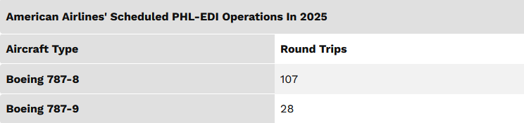 Indeed, 2025 has also seen American Airlines operate scheduled non-stop flights on this route using widebody twinjet aircraft from the Boeing 787 Dreamliner family. As noted in the table below, the smaller 787-8 model is the more popular choice on this front, with these 234-seaters operating almost four times as many flights as the larger 787-9, which has the capacity to accommodate 285 passengers onboard.